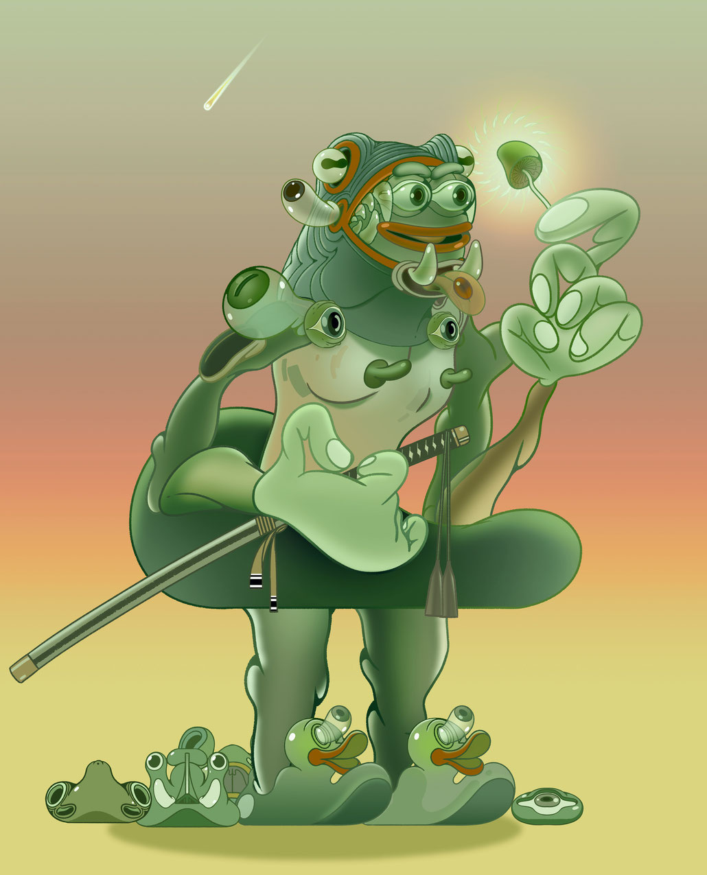 This piece envisions Pepe’s first steps on his journey to find himself. A journey to shed his skin,