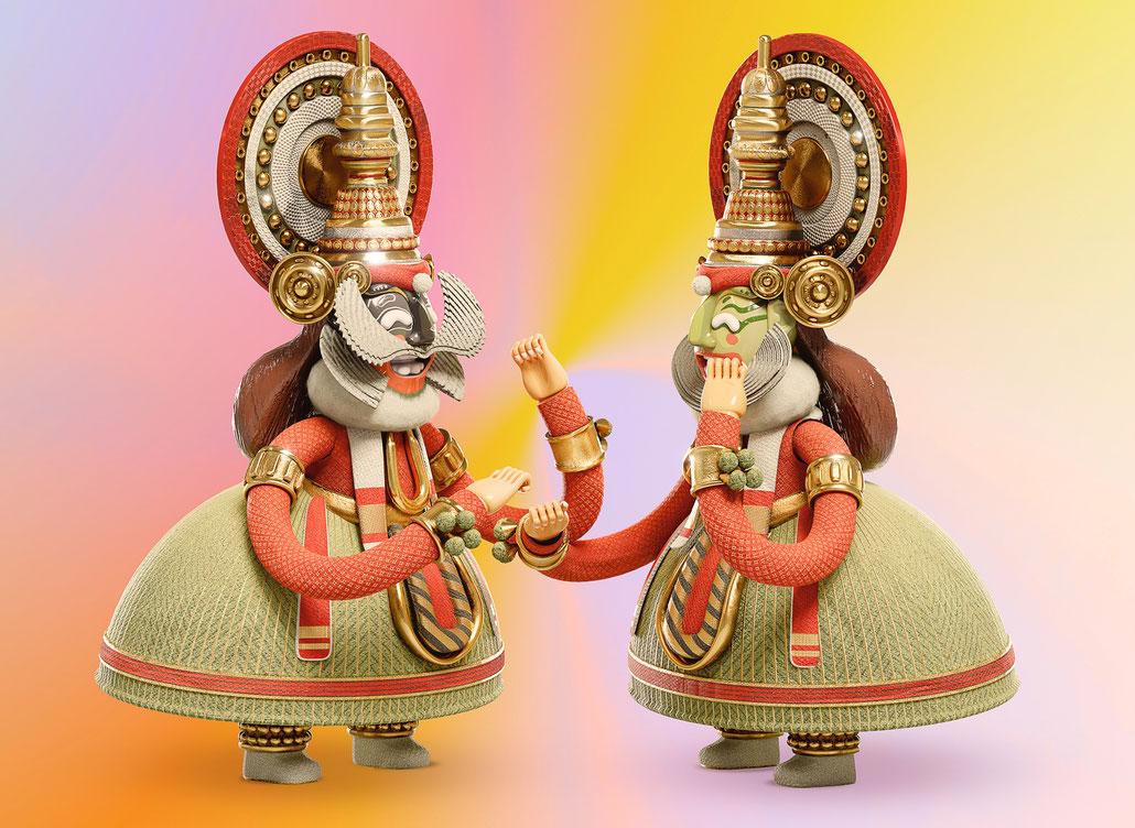 Two Kathakali Dancers good and evil coming together forming a yin yang